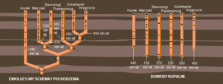 Rys. D1: Porównanie empirycznego świadectwa dotyczącego zwierzęcych skamieniałości z ewolucjonistycznym schematem. Uwagę zwracają niewidoczni wspólni przodkowie, "wskazywani" przez szkła powiększające oraz zniekształcenie w ewolucyjnym schemacie perspektywy chronologicznej.